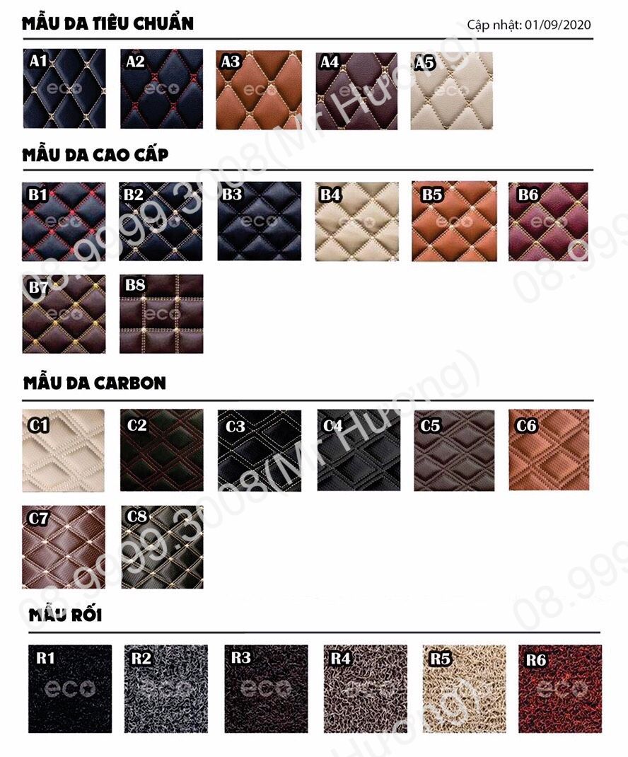 Chất liệu: Được làm từ nguyên liệu da PU, được tạo bởi 5 lớp khác nhau : bề mặt da mịn, lớp bông mút, lớp đệm mút, lớp dạ lót, lớp chống trượt. Thảm da 6D cao cấp